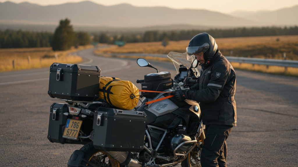 Distribute weight low and centered. Secure soft bags or a top box so nothing shifts, and keep essentials like documents, phone, and basic tools within reach.