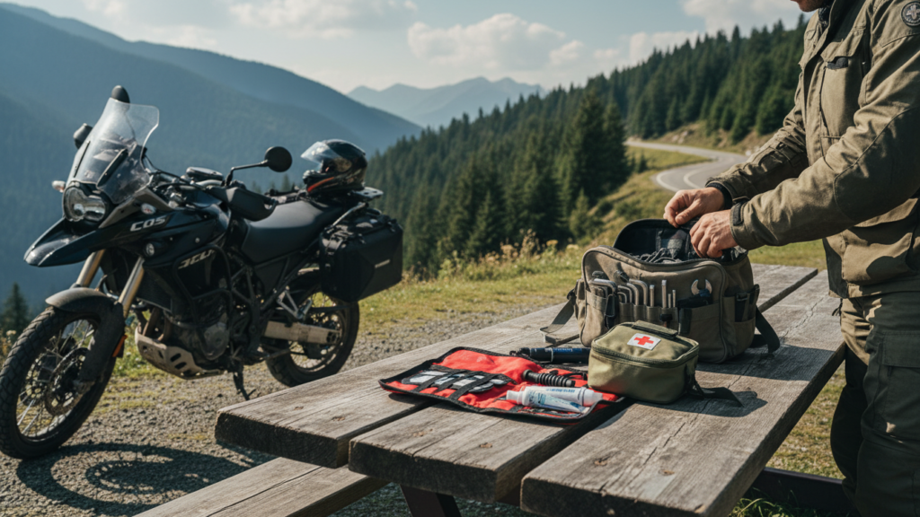 Bring electrical tape, zip ties, spare fuses, and a roll of chain lube. Store tools in labeled pouches inside a pannier or tank bag pocket for quick access. Practice using the tools at home so you can make roadside repairs confidently.