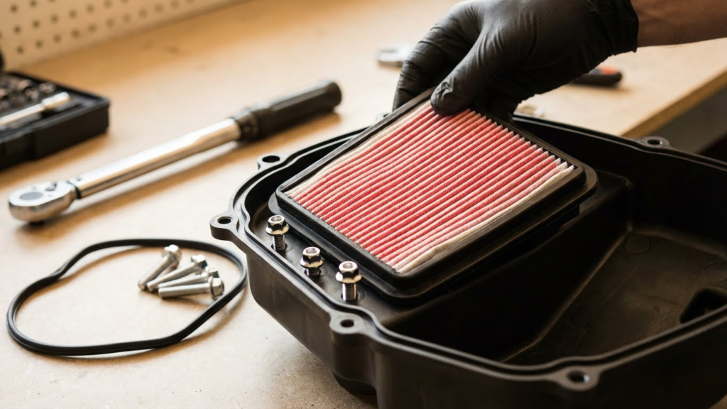I check the airbox seal, sealing surface, and mounting grommets before installing the filter. I install the filter so the sealing lip sits flat against the airbox; any twist or gap can let unfiltered air bypass the element. I hand-tighten clamps and screws first, then torque to the factory spec.