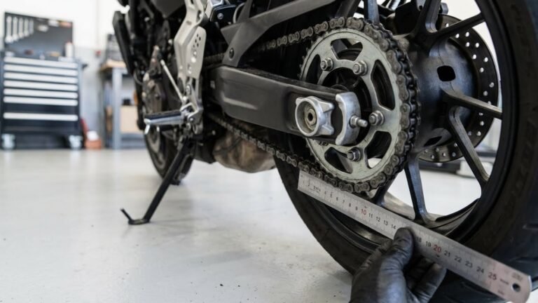 I recommend checking chain slack regularly and using your bike’s service manual values when available. Most street bikes need about 20–40 mm (around 1/2 inch to 1.5 inches) of up-and-down play in the lower run, but your manual may give a different number.