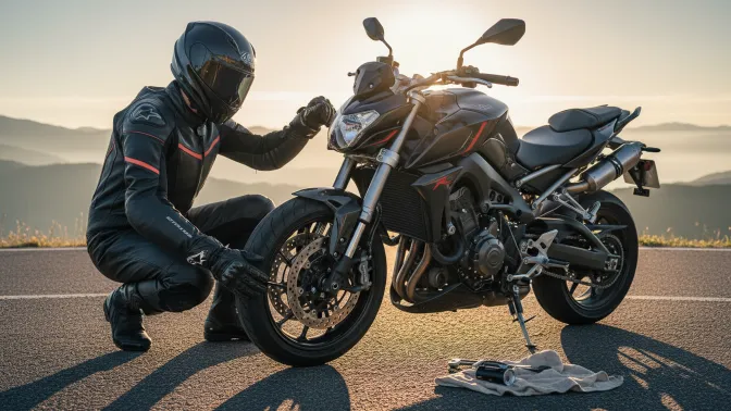 Before I start riding, I make sure my motorcycle is in good working order. I pay close attention to the parts that affect control and safety, focusing on the tires, brakes, fluids, and the drive system. These checks help me avoid problems while on the road.
